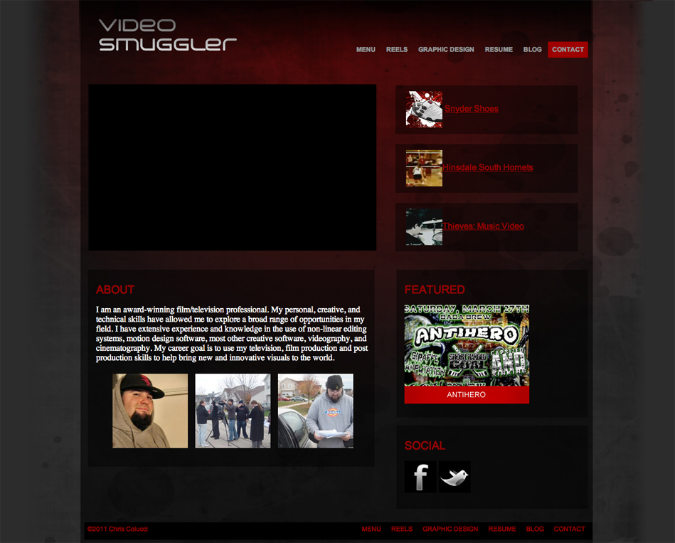 Portfolio site to highlight the clients video and graphic art work. Also included a wordpress blog, contact form, and access to social media.